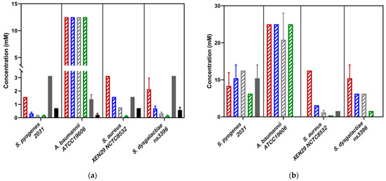 (a) Minimum inhibitory concentrations (MIC ) and (b) Minimum bactericidal concentrations (MBC) of novel scabicides against four scabies-associated bacteria. For all Streptococcus strains, the pure Ivermectin formulation was used. For S. aureus and A. baumannii, the Ivomec Pour-on Solution was used. Ivermectin did not show bactericidal activity against all strains tested. In the above bar chart, the β-triketones are shown in a striped pattern, with Flavesone in red, isoleptospermone in blue, leptospermone in grey and grandiflorone in green stripes. Abemetapir is presented in solid grey and ivermectin in in solid black.