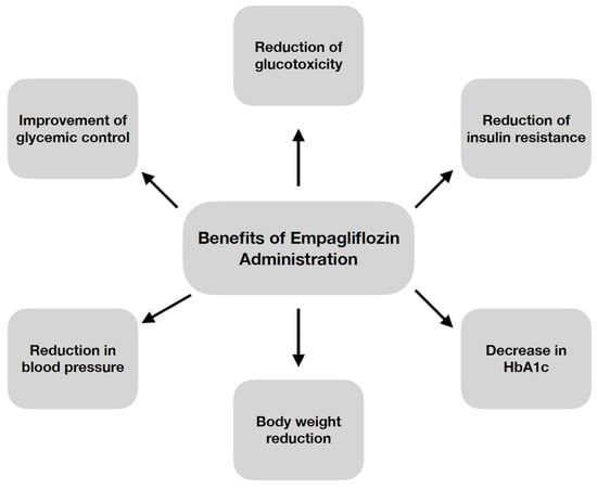 Empagliflozin acts selectively on SGLT2 transporters [2,3,7,8] compared to SGLT1 [3]. This is essential due to the fact that SGLT2 is expressed in proximal tubule segments [2,4,6], where 90% of glucose reabsorption occurs [2]. On the contrary, SGLT1 can be expressed in the intestines, heart, skeletal muscle [4], as well as in the proximal tubule segment responsible for only 10% of glucose reabsorption [2]. In addition, it has been shown that SGLT1 inhibition can lead to malabsorption, resulting in diarrhea [3]. The effects of empagliflozin result in a lowering of the renal threshold for glucose [2]. This leads to glucosuria and a decrease in plasma glucose levels [2,4,6,7] as well as a reduction in glycemic spikes and glycated hemoglobin A1C (HbA1C) levels (with prolonged use) [7]. Empagliflozin has pleiotropic effects. Some of its beneficial effects are shown in Figure 1 [2,3,4,6,7]. Moreover, empagliflozin has been demonstrated to reduce oxidative stress. The administration of this medication causes inhibition of reactive oxygen species (ROS) production, reduces the activity of prooxidant factors, as well as improves mitochondrial function [10].