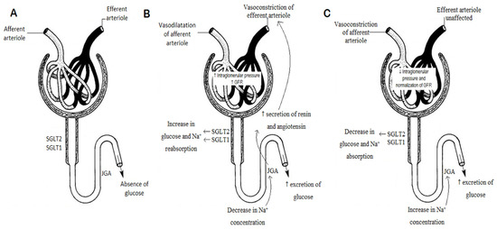 (A) Properly functioning nephron. (B) The mechanism of nephron impairment in the course of long-term, inappropriately treated DM. (C) Effect of SGLT2 inhibitor empagliflozin on improving intraglomerular pressure and GFR in DM [42]. SGLT1, SGLT2—sodium-glucose transport proteins, JGA—juxtaglomerular apparatus.