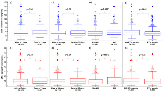 Plasma concentrations of Gas6 (blue boxes) and sMer (red boxes) according to 7- and 30-day mortality, AKI and RTI-r sepsis. Panels (a,b) show the results in relation to being alive or dead at 7 days; panels (c,d) show the results in relation to being alive or dead at 30 days; panels (e,f) show the results in relation to having AKI or not; panels (g,h) show the results in relation to having RTI-r sepsis or not (see Supplementary Material for details). Significant p-values are presented as bold, while the presence of * indicates that the multivariate analysis is also statistically significant for the biomarker. AKI: acute kidney injury; RTI-r: respiratory tract infection-related; sMer: soluble Mer.