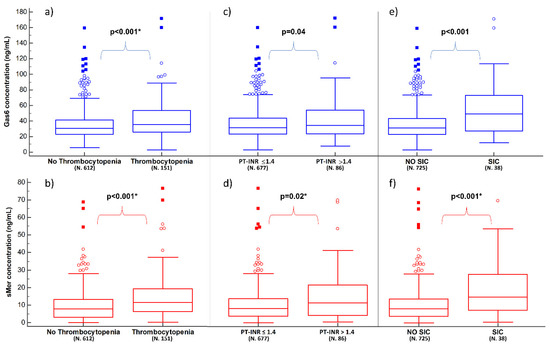 Plasma concentrations of Gas6 (blue boxes) and sMer (red boxes) according to thrombocytopenia, PT-INR derangement and SIC. Panels (a,b) show the results in relation to having thrombocytopenia or not; panels (c,d) show the results in relation to having PT-INR> or ≤1.4; panels (e,f) show the results in relation to having SIC or not (see Supplementary Material for details). Significant p-values are presented as bold, while the presence of * indicates that the multivariate analysis is also statistically significant for the biomarker. SIC: sepsis-induced coagulopathy.