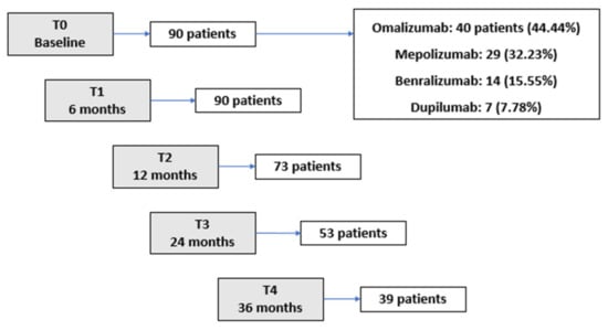 The choice of the biological drug depended not only on the indications for prescribing a specific monoclonal antibody but also on its reimbursement by the national health system. As shown in Figure 1, 40 patients (44.4%), received omalizumab (available in Italy since 2006), 29 (32.2%) received mepolizumab (available since 2017), 14 (15.6%) received benralizumab (available since 2019) and 7 (7.8%) received dupilumab (available since 2020).