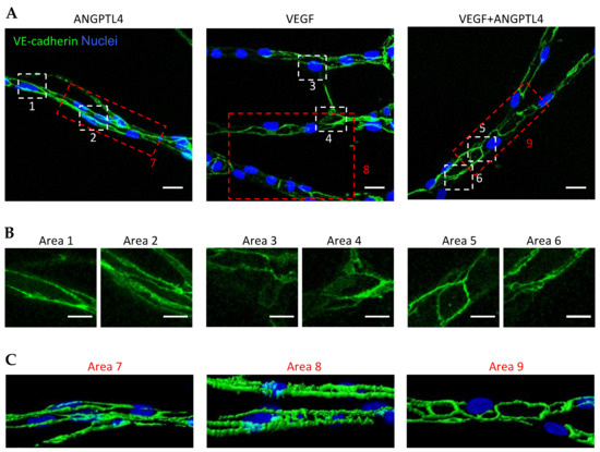 The present findings suggest that ANGPTL4 displays VEGF-dependent activity reminiscent of the outcome of Ang-2 in the presence or absence of VEGF-A [27]. As shown previously, VE-cadherin dynamics control VEGF-induced signal transduction and is therefore essential for the regulation of angiogenesis [28,29]. We thus analyzed VE-cadherin patterns in sprouting capillaries in the 3D angiogenesis model (Figure 2A). Depending on the treatment, VE-cadherin organization displayed a range of patterns from linear and continuous structures revealing straight cell–cell junctions (as example Area 1 in Figure 2B) to reticular plaques covering large cell–cell contact surface (as example Area 4 in Figure 2B). ANGPTL4-induced capillaries displayed linear or small reticular patterns of VE-cadherin mainly at lateral junctions (Figure 2B, Areas 1 and 2, respectively) whereas VEGF-induced capillaries contained VE-cadherin included in serrated structures or in large reticular plaques (Figure 2B, Areas 3 and 4, respectively). In capillaries grown in presence of ANGPTL4 and VEGF, VE-cadherin organization displayed linear pattern or small reticular structures (Figure 2B, Areas 5 and 6, respectively). Three-dimensional image reconstruction of the VE-cadherin patterns further confirms thin and linear structure in ANGPTL4-induced capillaries in absence or presence of VEGF (Figure 2C Areas 7 and 9, respectively) and serrated or thick structures in VEGF-induced capillaries (Figure 2C, Area 8).