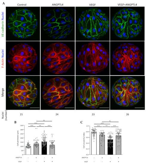 Endothelial cells seeded on beads were transferred after 24-h culture into µ-Slide 8 uncoated wells (Ibidi, Martinsried, Germany) and further cultured for 5 h in absence (control condition) or presence of VEGF (50 ng/mL) and/or ANGPTL4 (2.5 µg/mL) added to ECBM2. Fixation, permeabilization, and F-actin, nucleus or VE-cadherin staining were performed as described in Section 2.2.1. Images were acquired using Leica confocal SP5-inverted microscope (63× objective/1.4 NA). Cell perimeter and circularity were quantified using ImageJ.