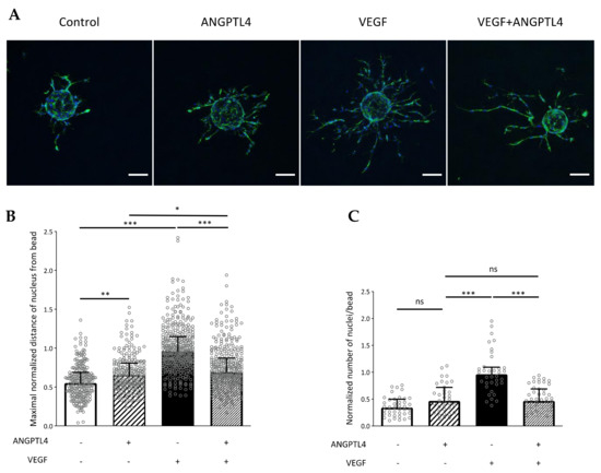 Endothelial cells seeded on beads were embedded after 24-h culture into a 2.5 mg/mL fibrin gel and further cultured for 48 h in absence (control condition) or presence of VEGF (2.5 ng/mL) and/or ANGPTL4 (2.5 µg/mL) added to ECGM2. Fixation, permeabilization, and F-actin or nucleus staining were performed as described in Section 2.2.1. Images were acquired using Zeiss Observer Apotome 2 (10× objective). Three-dimensional migration was assessed using Imaris software for both quantification of the maximal distance covered by the cells from the bead (over the 10% maximal values of nucleus distances) and of the nuclei number emerging out of the bead surface.