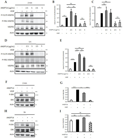 Short- and long-term regulation of VEGFR2 signaling. Endothelial cells were stimulated without or with ANGPTL4 (2.5 or 5 µg/mL) and/or VEGF (50 ng/mL). Phosphorylation of VEGFR2 at tyrosine sites 951 and 1175 was analyzed after 2 min (A–C) or 5 h (D,E) stimulation. Phosphorylation of ERK was analyzed after 2 min (F,G) or 5 h (H,I) treatment by ANGPTL4 (2.5 µg/mL) and/or VEGF (50 ng/mL). Immunoblots are representative of several independent experiments (3 for (B,E,G,I); 5 for (C)). Blot image cuts are indicated by dotted white lines. Actin immunoblot was used as loading control. Graphs represent mean values (+SEM) of the ratio of phosphorylated protein over total protein. Individual values are normalized to the mean value of VEGF condition for each experiment. ns: p > 0.05, * p ≤ 0.05, ** p ≤ 0.01, *** p ≤ 0.001 (one-way ANOVA).