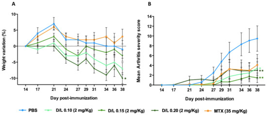 Influence of drug-to-lipid (D/L) ratio on weight loss and therapeutic efficacy of folate-targeted liposomes encapsulating methotrexate (FL-MTX) in collagen-induced arthritis (CIA) mice. (A) Average weight variation after treatment. (B) Average clinical score as a function of time. All treatments were injected at 2 mg/kg of MTX, twice a week (n = 12). Significant differences between liposomes and the vehicle group (PBS) were detected as shown by an * p < 0.05 and ** p < 0.01.
