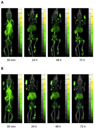 Pharmacokinetics of 111In-labelled liposomes encapsulating methotrexate (MTX) assessed by nuclear imaging Single Photon Emitted Computed Tomography (SPECT-CT). (A) Non-targeted liposomes (L-MTX). (B) Folate-targeted liposomes (FL-MTX). Please note at 30 min the early targeting of inflamed joints and the strong signal from vessels. Targeting in inflamed joints remains very stable over time in inflamed joints.