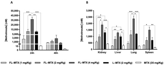 Distribution of FL-MTX in a dose-dependent manner compared to non-targeted liposomal MTX (L-MTX) and free MTX (MTX). (A) Serum MTX concentration at 24 h and 48 h post i.p. injection. (B) MTX concentration in non-target tissues 24 h post i.p. injection. Significant differences between all groups (liposomes and MTX) were detected as shown by an * p < 0.05, ** p < 0.01 and *** p < 0.001.
