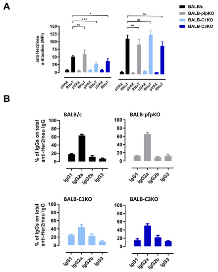 Complement, but not perforin, deficiency limits the vaccine-induced anti-Her2 antibody response. (A) Anti-Her2 total IgG titers after two (left panel) and three (right panel) pVAX or RHuT vaccination courses in BALB/c (black bars; n = 14), BALB-pfpKO (grey bars; n = 7), BALB-C1KO (light blue bars; n = 6), and BALB-C3KO (blue bars; n = 9) mice. Data are expressed as means ± SEM of the mean fluorescence intensity (MFI) of each serum. ns, not statistically significant; * p = 0.04; *** p = 0.0002, Student’s t-test. (B) Percentage of anti-Her2 IgG isotypes in the sera of RHuT vaccinated BALB/c, BALB-pfpKO, BALB-C1KO, and BALB-C3KO mice.