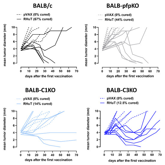 Pfp and complement deficiencies decrease the ability of vaccination to cure established Her2+ TUBO tumors. BALB/c (black lines; n = 11), BALB-pfpKO (grey lines; n = 20), BALB-C1KO (light blue lines; n = 11), and BALB-C3KO (blue lines; n = 11) were vaccinated three times with the empty pVAX (dotted lines) and with RHuT (continuous lines) plasmids when they displayed a 4 mm mean diameter TUBO tumor. Each line refers to an individual tumor.