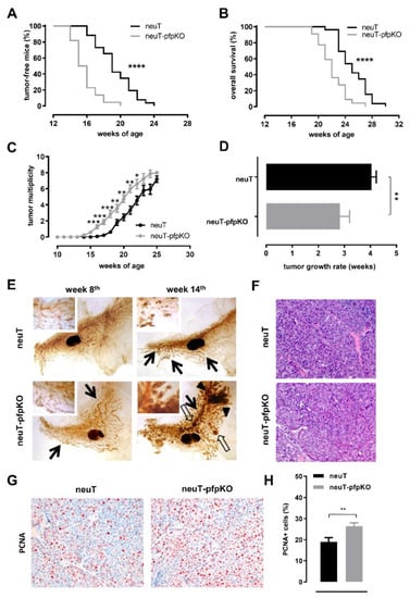 The morphological analysis performed on whole-mount stained mammary glands showed that, in neuT-pfpKO females at the 8th week of age, side buds were more numerous and widespread, although their dimensions were similar to those found in neuT females (Figure 4E, left panels). At week 14, these mammary lesions greatly expanded and merged to form large areas of solid invasive carcinomas, while those in neuT mice grew slowly and remained more evident only in the proximal part of the mammary gland (Figure 4E, right panels). Histological and immunohistochemical analysis of clinically evident mammary tumors in 20-week-old mice of both strains revealed solid, moderately differentiated mammary adenocarcinomas (Figure 4F). In complete accordance with the earlier onset and rapid growth of tumors in neuT-pfpKO mice, a significantly higher expression of the PCNA proliferation marker was observed in these mice compared to neuT females (Figure 4G,H).