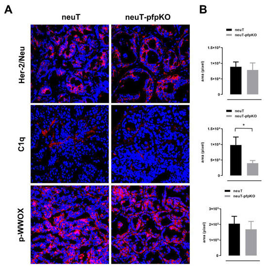 The accelerated tumor growth observed in neuT tumors from complement-deficient mice was associated with reduced activation of the tumor suppressor WWOX and stronger Her2 oncoprotein expression [32]. In order to evaluate the weight of WWOX activation and Her2 expression in the increased growth rate observed in neuT-pfpKO mice, immunofluorescent staining for pWWOX and Her2 were performed on 6–8 mm mean diameter tumors from neuT and neuT-pfpKO mice. Differently to what was observed in complement deficient neuT mice, comparable levels of Her2 were found (Figure 5A,B). Interestingly, in accordance with data observed in the transplantable TUBO model, a significant decrease in C1qA deposition was evident in tumors from neuT-pfpKO mice. Nevertheless, even in this case, C1qA-reduced deposition was not associated with a decrease of pWWOX (Figure 5A,B).