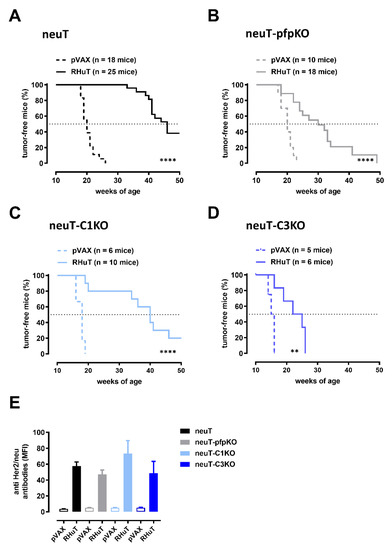 Pfp and complement deficiency reduces vaccine-induced antibody activity. Tumor onset in neuT (A), neuT-pfpKO (B), neuT-C1KO (C), and neuT-C3KO (D) mice vaccinated either with pVAX (dotted lines) or RHuT (continuous lines) plasmids. ** p = 0.007; **** p < 0.0001; log-rank, Mantel-Cox test. The dotted lines in the graphs indicate 50% tumor-free mice. (E) Anti-Her2 total IgG titers in neuT (black bars), neuT-pfpKO (grey bars), neuT-C1KO (light blue bars), and neuT-C3KO (blue bars) mice vaccinated either with pVAX (empty bars) or RHuT (filled bars) plasmids. Data are expressed as means ± SEM of the mean fluorescence intensity (MFI) of the sera from vaccinated mice.