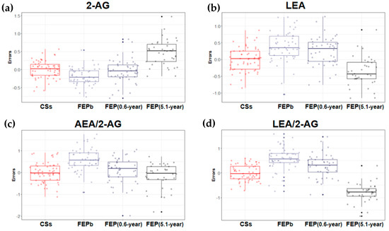 Boxplots of the variation of prediction errors of log-transformed levels of eCB, eCB-like compound, their ratios (a–g), and BMI (h) (derived by regressing out covariate effects) for control subjects (CSs) and first-episode (FEP) patients at baseline (FEPb, before treatment with antipsychotics (AP)), after 0.6-year (FEP(0.6-year)), and after 5.1-year (FEP(5.1-year)) treatment with AP. The solid horizontal line in each box represents the median. The area above and below the line represents the 50th to the 75th and the 25th to the 50th percentiles, respectively. The whiskers extend to the highest and lowest values contained within 1.5 times the interquartile range of the data. Each calculated error is represented as a dot.