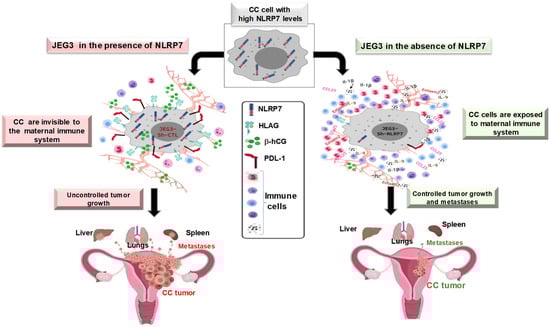 Importantly, the in vivo study that used the orthotopic model of CC, which was injected within its placenta with NLRP7 invalidated-CC cells, showed higher maternal immune response and that the mice developed smaller tumors and displayed less metastases. Furthermore, we observed a strong increase in the levels of IL-1β, both locally in mouse placenta and in the maternal serum. This finding strongly suggests that the expression of NLRP7 by the trophoblast cells contribute to its camouflage by the maternal environment (Figure 2). In line with this assumption, we observed that malignant cells that were inactivated for NLRP7 exhibited significant decrease in the expression of proteins that contribute to maternal immune tolerance. These include PD-L1, HLA-G and hCG. The latter hormone has recently been reported to increase the activity of regulatory T cells (Treg) and to retain the tolerogenic activity of dendritic cells [69,70]. Importantly, these findings strongly support a local immune tolerance that is mediated by malignant cells- secreted hCG. This hormone is known to act as a strong chemoattractant for T-suppressors that are apoptotic actors for T-lymphocytes.