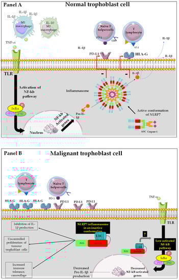 Representation of the mode of function of NLRP7 in normal and tumor trophoblast cells. (A): NLRP7 is normally expressed in trophoblast cells and functions in an inflammasome-dependent manner to allow maturation of pro-IL-1β to IL1β. The transcription of pro-IL-1β depends on the activation of NF-κB that translocates into the nucleus and increases the transcription of pro-IL-1β. NLRP7 also regulates the expression of HLA-G and PD-L1 to allow normal tolerance of the trophoblast by the maternal immune system and favors the polarization of macrophages to M1 subtype. All these processes allow the protection of the fetus and ensure the progress of the pregnancy. (B): In malignant trophoblast cells, NLRP7 is overexpressed and functions in an inflammasome-independent manner. NLRP7 in turn mediates the increase in HLA-G and PD-L1 expression. This exacerbates maternal immune tolerance and camouflage of the tumor cells, creating a favorable, ant—inflammatory environment for tumor growth. NLRP7 overexpression mediates the excessive proliferation of trophoblast cells and suppresses their differentiation, allowing for further migration and invasion that ultimately leads to metastasis of distinct maternal organs.