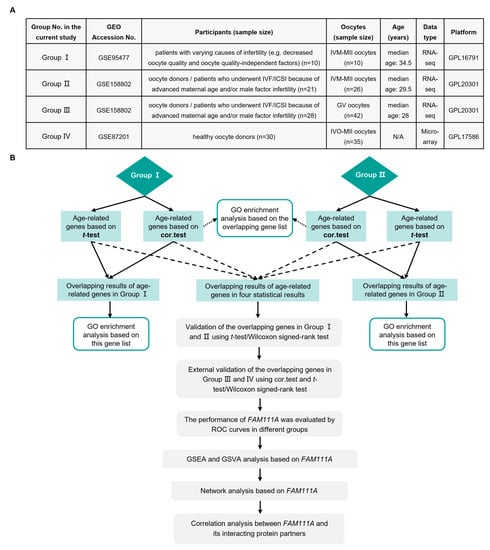 Summary of the present study. (A) Groups included in the analysis of this study. (B) Flowchart of this study. GEO, Gene Expression Omnibus; IVF/ICSI, in vitro fertilization/intracytoplasmic sperm injection; IVM-MII, in vitro maturation-metaphase II; GV, germinal vesicle; IVO-MII, in vivo ovulation-metaphase II; N/A, not available; cor.test, Spearman rank correlation; GO, Gene Ontology; ROC, receiver operating characteristic; GSEA, Gene Set Enrichment Analysis; GSVA, Gene Set Variation Analysis; FAM111A, FAM111 Trypsin-Like Peptidase A.