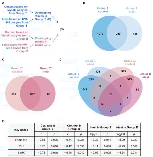 Analysis of age-related genes. (A) Flowchart of the age-related analysis. (B) Overlapping results of cor.test and t-test for IVM-MII oocytes from Group I. (C) Overlapping results of cor.test and t-test for IVM-MII oocytes from Group II. (D) Overlapping results of age-related genes in Group I and Group II. (E) Based on the cor.test and t-test, FAM111A, IDI1, and LY6K are the statistically significant age-related genes in both Group I and Group II. IDI1, Isopentenyl-Diphosphate Delta Isomerase 1; LY6K, Lymphocyte Antigen 6 Family Member K. FC, fold change.