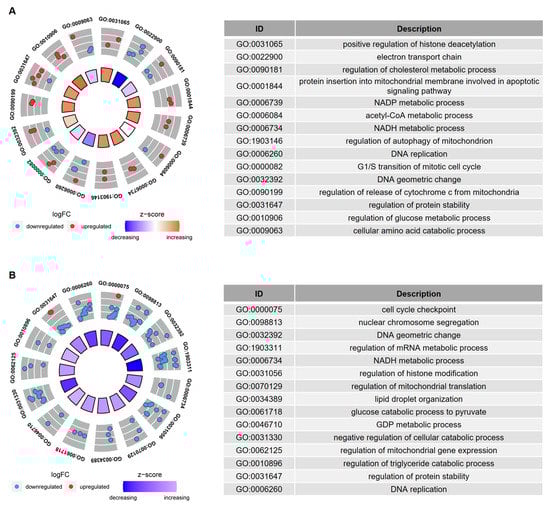 GO enrichment analysis of the age-related genes in IVM-MII oocytes from (A) Group I and (B) Group II. The age-related genes in this analysis were obtained from the overlapping cor.test and t-test results. The inner circle in the left figure indicates the Z-score value. The outer ring represents the significantly enriched terms, and the most upregulated and downregulated genes. The blue dot indicates the downregulated gene and the red dot indicates the upregulated gene. The right figure is the description of the enriched GO terms.