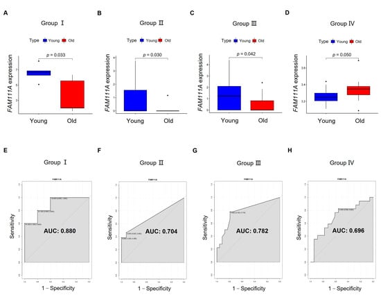 The capability of FAM111A for distinguishing young and old oocytes. The expression of FAM111A in the oocytes from young and old groups is visualized in (A) Group I and (B) Group II, and further validated in (C) Group III and (D) Group IV. The x-axis represents young and old oocytes. The y-axis represents FAM111A expression. p-values were calculated using a t-test or Wilcoxon signed-rank test. ROC curves are visualized in (E) Group I, (F) Group II, (G) Group III, and (H) Group Ⅳ. The x-axis of the ROC graph represents 1—specificity, and the y-axis represents sensitivity. AUC, area under the curve.