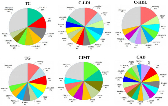 Multifactor Dimensionality Reduction (MDR) is one of the most popular bioinformatics methods for nonparametric analysis of gene–gene and gene–environment interactions, allowing simultaneously assess to numerous variables, including gene polymorphisms, qualitative and quantitative phenotypes by reducing the dimension of the number of calculated parameters, thereby facilitating the detection of non-linear or non-additive interactions among the assessed attributes [32,33]. In the present study, we used the model-based multifactor dimensionality reduction (mbmdr) method allowing to detect multiple sets of significant gene–gene (G × G) and/or gene–environment (G × E) interactions in relation to a trait of interest [30,31]. Two-, three-, and four-order G × G and G × E models, including combinations of SNPs and smoking habits, were analyzed using the statistical package mbmdr for R, version 3.5.3 to identify associations with the levels of plasma lipids, carotid intima-media thickness, and the risk of coronary artery disease were analyzed. Six two-order, 39 three- order, and 147 four-level statistically significant MDR models (Pperm < 0.05) associated with the normalized blood cholesterol levels were established. The best n-order mbmdr models associated with TC, C-LDL, and CAD risk are summarized in Table 9, Table 10 and Table 11, respectively. To prioritize the attributes associated with each cardiovascular phenotype, we counted the number of n-models in which each attribute was involved, and the resulted value was considered as a measure of the contribution of an attribute (a variable such as SNP or smoking status) to the polygenic background, as estimated by the mbmdr method. Figure 2 presents diagrams illustrating the contribution (%) of each attribute to the cardiovascular phenotypes (attributes are presented in descending order of the number of models in which attributes are involved). In particular, the leading SNPs contributing to the levels of total cholesterol in plasma of CAD patients were GALNT2 (16%), LPA (11%), SCARB1 (10%), APOC1 (8%), LILRA3 (8%), ST3GAL4 (6%), COBLL1 (6%), and PSKH1 (5%). Thus, 70% of the identified G × G mbmdr models associating with plasma level of TC comprised the above eight polymorphisms. It is noteworthy that the number of G × E models (SNP-smoking interactions) associated with TC was relatively small (1.7% for three-order and 4.9% for four-order mbmdr models). A total of 39 two-order, 281 three-order, and 1704 four-order GxG and G × E models were found to affect the normalized levels of LDL-C. As can be seen from Figure 2, the total proportion of models involving smoking status (12%) and ABCA1 (8%), CETP (7%), NPC1L1 (7%), and PLTP (6 %) loci was 39%. Notably, the quantity of mbmdr models comprising smoking status was 11% for 4-order models, 13% for 3-order models and 21% for 2-order models suggesting synergic effects tobacco smoking and these SNPs on the atherogenic fraction of lipoproteins. In total, 37 two-order, 183 three-order, and 624 four-order G × G and G × E models significantly associated with normalized HDL-C levels were identified. A significant proportion of mbmdr models included smoking habit: 16% for 4-order models, 15% for 3-order models, and 30% for 2-order models. In addition, 55% of the GxG and G × E models involved interactions between CETP, PLTP, ST3GAL4, NPC1L1, PSKH1, F2, ABCA1, PPP1R3B, and APOC1 gene polymorphisms. A majority of mbmdr models associated with normalized levels of plasma triglycerides comprised interactions between ABCA1 (9%), LPA (8%), STARD3 (7%), PLTP (7%), PSKH1 (7%), SCARB1 (6%), NPC1L1 (6%), APOC1 (6%), and ST3GAL4 (5%) loci. The mbmdr method allowed establishing 14 two-order, 45 three-order, and 73 four-order GxG and G × E models associated with normalized CIMT. About 70% of G × G and G × E models associated with CIMT included interactions between polymorphisms of ST3GAL4 (15%), GALNT2 (10%), COBLL1 (9%), PSKH1 (9%), APOC1 (8%), PPP1R3B (8%), LILRA3 (6%), and PLTP (6%) genes. Smoking status was present in 11% of the two-order, 6% of the three-order, and 7% of the four-order models. As can be seen from Table 11, the best models of G × G and G × E interactions associated with the risk of coronary artery disease included rs3136441 of F2, rs55730499 of LPA, rs881844 of STARD3, rs838880 of SCARB1, and rs12328675 of COBLL1 gene polymorphisms. Sixteen SNPs such as F2 (9%), LPA (8%), STARD3 (7%), SCARB1 (6%), PLTP (6 %), PPP1R3B (6%), ABCA1 (6%), APOC1 (6%), GALNT2 (6%), COBLL1 (6%), CETP (5%), ZNF648 (5%), LILRA3 (5%), ST3GAL4 (5%), PSKH1 (5%), and NPC1L1 (4%) showed a comparable contribution to CAD susceptibility. Figure 2 shows the contribution of the studied lipid-associated GWAS loci and smoking to the polygenic mechanisms underlying cardiovascular phenotypes such as plasma lipids, CIMT, and coronary artery disease. A percentage of contribution for each factor was estimated as a proportion of mbmdr models in which a particular risk factor is involved.