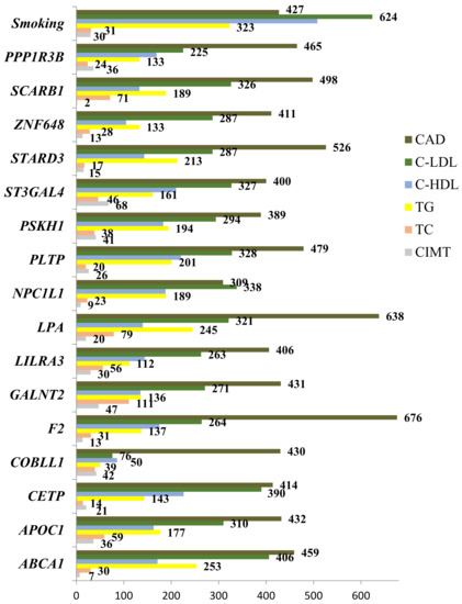 It is known form the literature, allele rs3136441-C of the F2 gene is associated with an increase in HDL-C [8]. We found that the SNP is associated with plasma levels of total cholesterol exclusively in smokers. Our study is actually the first to show the relationship between SNP rs3136441 of the F2 gene and the development of coronary artery disease, as well as the level of total cholesterol, LDL-C and HDL-C. Allele rs55730499-T of the LPA gene is known to be associated with increased levels of lipoprotein (a) [26], coronary artery disease [9,49], and a short life expectancy [50,51]. We also confirmed the association of allele rs55730499-T of LPA with an increased risk of CAD in the Russian population. In addition, significant associations of this SNP with an increased level of TC and LDL-C and with a decreased level of HDL-C and TG have been identified in our study for the first time. It is known from the literature that SNP rs6065906 at PLTP is associated with the levels of triglycerides and HDL-C [8,44]. We also confirmed an association of this SNP with the level of triglycerides. Furthermore, our study revealed, for the first time, that the rs6065906-T of PLTP is associated with the increased risk of coronary artery disease. According to the summary data of GWAS catalog (https://www.ebi.ac.uk/gwas/, accessed on 2 July 2019), the rs3764261-A allele located near the CETP and HERPUD1 genes is associated with an increase in the HDL cholesterol, a decrease in LDL-C and TG [8], and an increase in total cholesterol in plasma [52]. We also observed the association of allele rs3764261-A with increased levels of total blood cholesterol, but this finding occurred only in smokers. However, in contrast to previously published data, the rs3764261-A allele is associated with an increased level of LDL-C and a decreased level of HDL-C, indicting a discrepancy between ours and other studies. As can be seen from the literature, rs4846914-G allele of the GALNT2 gene is associated with a decrease in HDL cholesterol levels and an increase in blood TG [25,44], whereas we observed an association of this SNP with an increase in total blood cholesterol levels. We also observed that the rs9987289-G allele of PPP1R3B is associated with increased levels of blood TC, a finding that is consistent with the results obtained by Willer with co-workers [8]. In addition, SNP rs9987289 at PPP1R3B is known to be associated with LDL-C and HDL-C levels [8]. We found that polymorphism rs16942887 of the PSKH1 gene is associated with increased levels of total cholesterol in plasma exclusively in smokers, and this association is found for the first time. It is known that rs16942887 of the PSKH1 gene is associated with HDL-C and TG levels [44,53]. We also observed a relationship between the rs838880-C allele of the SCARB1 gene and increased levels of TC and LDL-C, the findings that are partially concordant with previously published papers. In particular, it is known that allele rs838880-C is associated with an increase in TC [54] and HDL cholesterol in plasma [8]. The present study also showed that SNP rs1883025 of the ABCA1 gene is associated with an increase in LDL-C levels in smokers. According to the study of Hoffmann with co-authors [44], polymorphism rs1883025 SNP is also associated with LDL-C, but the association has not been investigated in subgroups of patients stratified by smoking status. SNP rs1883025 of the ABCA1 gene is known to be associated with the levels of TC [12] and HDL-C [8]. In addition, the present study was the first to investigate relationship between the lipid-related GWAS loci and carotid intima-media thickness in patients with coronary artery disease. In particular, we found that the rs1689800-G allele of the ZNF648 gene (locus LINC01344) is associated with an increase in LDL-C levels in smokers and increased CIMT. Interestingly, allele rs1689800-G was found to be associated with decreased levels of HDL cholesterol [8,12]. Meantime, the present study showed that polymorphisms such as rs217406 NPC1L1 and rs881844 STARD3 are associated with a decreased CIMT, but exclusively in non-smoker patients. The rs217406-G allele of NPC1L1 was also linked to a decrease in blood TG levels in our study and this association was also revealed in a study of Willer with co-workers [8]. Polymorphism rs881844 at STARD3 associated with CIMT was also associated with decreased levels of HDL-C [44,55]. We also found, for the first time, SNPs rs12328675 of COBLL1 and rs11220463 of ST3GAL4 are associated with a decreased CIMT. SNP rs12328675 at COBLL1 is known to be associated with the levels of HDL-C [8] and triglycerides [44].