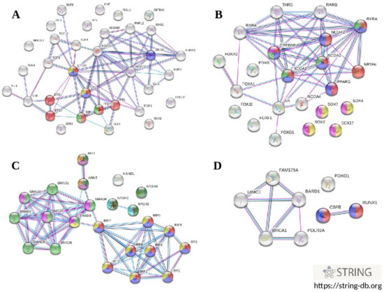 Figure 4. Interactomic networks involving transcription factors whose binding sites were in silico predicted at the alleles associated with cardiovascular phenotypes. (A) transcription factors associated with allele rs4420638-G of APOC1; (B) transcription factors associated with allele rs3136441-T of F2; (C), transcription factors associated with allele rs55730499-T of LPA; (D), transcription factors associated with allele rs6065906-C of PLTP.