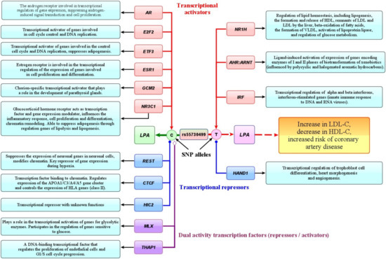 Figure 5. Putative effects of transcription factors whose allele-specific binding sites were in silico predicted at SNP rs55730499 of the LPA gene. (The color of arrows depicts the molecular effects of transcription factors (TF) on gene expression by binding to a specific SNP allele: red—transcription activators, blue—transcription repressors, purple—transcription factors with dual activity (repressors or activators). The light blue labels depict the main biological effects of TFs.)