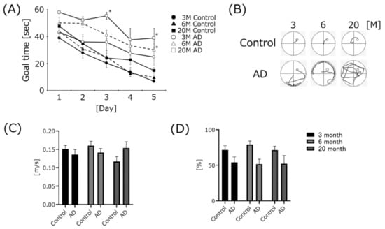 Differences in cognitive function between control and Alzheimer’s disease (AD) transgenic mice depending on age. The time to goal (escape latency) in the Morris water maze test is shown in panel (A). The swimming trajectory and swimming speed are shown in panels (B,C). The ratio of staying time in the platform quadrant is shown in panel (D). Three different ages of AD mice (3 M, 6 M, 20 M) were used (3 M AD, n = 10; 6 M AD, n = 10; 20 M AD, n = 5). Age-matched C57BL/6 mice were used as a control group (3 M control, n = 15; 6 M control, n = 15; 20 M control, n = 10). * p < 0.05, vs. the age-matched control group. The data are shown as means ± SE. Statistical analyses of goal time were performed using two-way analysis of variance. Statistical analysis of goal time among all group was performed using the two-way analysis of variance. Statistical analyses of the goal time of each day, swimming speed, and the ratio of staying time in the platform quadrant were performed using the Tukey–Kramer method.