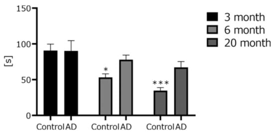 Time to fall in the rota-rod test. Three different ages of AD mice (3 M AD, n = 8; 6 M AD, n = 8; 20 M AD, n = 8) and age-matched C57BL/6 mice (3 M control, n = 8; 6 M control, n = 8; 20 M control, n = 5) were used. * p < 0.05 *** p < 0.001 vs. 3 M control. The data are shown as means ± SE. Comparisons were performed using the Tukey–Kramer method.