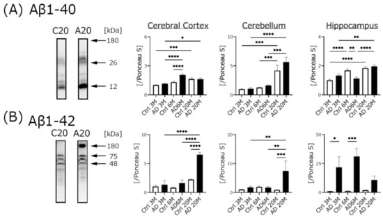 Changes in the levels of Aβ protein according to Western blot and immunohistochemical analyses. Western blotting experiments were performed using three different ages (3, 6, and 20 months) and three different brain regions (cerebral cortex, Cortex; cerebellum, Cer; hippocampus, Hip). Total protein expression in all bands was calculated for Aβ1-40 analysis (A). For Aβ1-42 analysis, the high-molecular-weight band (amyloid fibrils) was used for calculation (B). The ratio of each protein band intensity to Ponceau S intensity is shown in panels (A) and (B), with the ratios of each brain region of 3 M control samples set to 1. Black columns show 3 M, 6 M, and 20 M AD transgenic mice (3 M AD, n = 9; 6 M AD, n = 8; 20 M AD, n = 5), and white columns show age-matched C57BL/6 mice (3 M control, n = 10; 6 M control, n = 10; 20 M control, n = 10). Asterisks show significant differences (* p < 0.05, ** p < 0.01, *** p < 0.001, **** p < 0.0001). The data are shown as means ± SE. Comparisons were performed using the Tukey–Kramer method; 6 M AD and control mice were used.