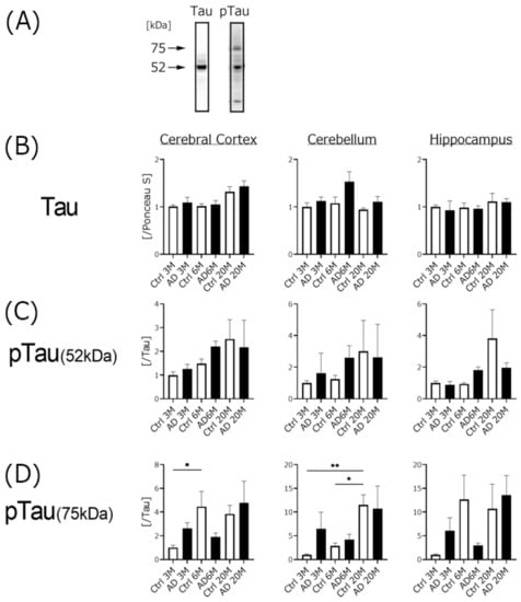 Western blotting analysis of the levels of tau and phospho6-tau expression in the brains of three different ages of AD mice. All experiments were performed using three different brain regions (cerebral cortex, Cortex; cerebellum, Cre; hippocampus, Hip). Western blotting images are shown in panel (A). Tau protein expression was calculated and shown in panel (B). Phospho-tau protein expression was calculated using two different band sizes (52 (C) and 75 kDa (D)). The ratio of each phospho-tau band intensity to Ponceau S intensity is shown, with the ratios of each brain region of 3 M control samples set to 1. Black columns show 3 M, 6 M, and 20 M AD mice (3 M AD, n = 10; 6 M AD, n = 10; 20 M AD, n = 5), and white columns show age-matched C57BL/6 mice (3 M control, n = 10; 6 M control, n = 10; 20 M control, n = 5). Asterisks show significant differences (* p < 0.05, ** p < 0.01). The data are shown as means ± SE. Comparisons were performed using the Tukey–Kramer method.