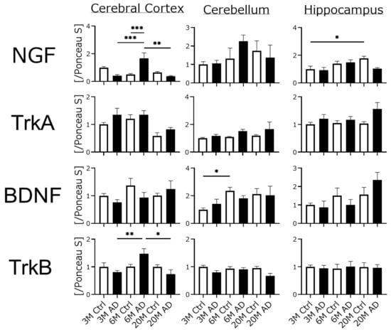 Western blotting analysis of the levels of neurotrophic-factor-related proteins in the brains of three different ages of AD transgenic mice. All experiments were performed using three different brain regions (cerebral cortex, Cortex; cerebellum, Cre; hippocampus, Hip). The ratio of each protein band intensity to Ponceau S intensity is shown, with ratios of each brain regions of 3 M control samples set to 1. Black columns show 3 M, 6 M, and 20 M AD mice (3 M AD, n = 8; 6 M AD, n = 8; 20 M AD, n = 4), and white columns show age-matched C57BL/6 mice (3 M control, n = 8; 6 M control, n = 8; 20 M control, n = 8). Asterisks show significant differences (* p < 0.05, ** p < 0.01, *** p < 0.001). The data are shown as means ± SE. Comparisons were performed using the Tukey–Kramer method.