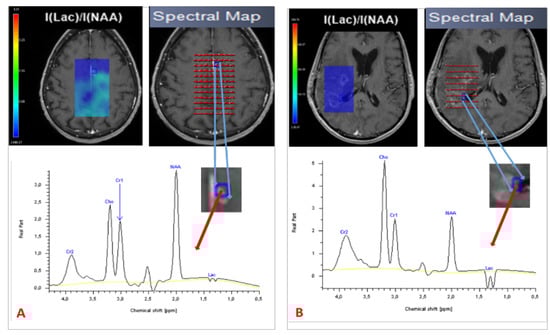 Since the late 1980s, proton magnetic resonance spectroscopy (MRS) has been used to provide a noninvasive measure of brain metabolites []. Tumors have an abnormal metabolism compared with normal tissue. In that sense, MRS is valuable for establishing a clinical diagnosis, monitoring the effects of treatment and understanding disease mechanisms []. MRS is able to depict structural damage in brain tissue after RT before symptoms develop and before evidence of changes that can be observed using conventional MRI []. Different acquisition parameters can be modified to optimize MRS data acquisition. These parameters determine not only the appearance of the spectrum but also the information that can be extracted from it. One of the most relevant is echo time. At present, the echo time used in in vivo MRS by most groups ranges between 18 and 288 ms [,]. Three classes of spatial localization techniques are used in MRS: the single-voxel technique, which records spectra from one region of the brain at a time, and the multivoxel technique, in 2D, 3D, or whole-brain MRS, that records spectra from multiple regions and thereby maps the spatial distribution of metabolites within both normal tissue and most heterogeneous lesions dimensions []. Multivoxel spectroscopy is a chemical shift imaging of hydrogen and other atoms, such as phosphorus, sodium, and potassium, in different molecules, shown as a spectral pattern. MRI and MRS have provided important information on the pathophysiology of central nervous system radio-induced damage []. MRS has been investigated as a means of improving the detection of tumor infiltration []. It can detect and quantify different metabolites in vivo, with promising results for prognosis and treatment response [,] as well as for guiding radiotherapy dose painting []. Analysis of choline (Cho) and N-acetyl aspartate (NAA) peaks is of particular interest in studies of brain tumors []. Cho is a marker of cell membrane proliferation and is elevated in tumors. NAA is related to mature neuronal density and viability, and is decreased in tumoral tissue []. Lactate (Lac) is an end product of glycolysis and increases rapidly during hypoxia and ischemia. Creatine (Cr) peak is a marker for intracellular energy states that rarely varies and is used as an internal reference. A lipid peak appears in the event of membrane destruction due to necrosis []. Spectra from newly diagnosed or relapsing GBM differ from normal brain spectra, with decreased levels of NAA and often increased levels of Cho and Lac []. A Cho/NAA value >2 indicates a high-grade glioma []. Establishing a differential diagnosis between PsP and TP based on MRS findings is highly challenging, particularly with the use of single-voxel acquisitions. Both types of lesion can exhibit neuronal loss/dysfunction (low NAA), abnormal cellular membrane attenuation/integrity (high Cho), and anaerobic metabolism (high Lac/lipid ratio), (Figure 3). An elevated Cho/NAA ratio has been correlated with evidence of tumor recurrence [,,,]. To diagnose PsP, Sawlani et al. demonstrated elevated lipid signals on MRS []. An absence of Cho or a low Cho/NAA ratio was also observed. By contrast, patients with TP had lower lipid signals and a high Cho/NAA ratio. The presence of elevated lipid signals, along with a low Cho/NAA ratio, can help to differentiate PsP from TP []. Anbarloui et al. found that the mean Cho/NAA ratio for TP was 2.72, compared with just 1.46 for RN (p < 0.01) []. Another promising approach is 3D echoplanar spectroscopic imaging, which analyzes a large volume with greater resolution, as described by Verma et al., who distinguished TP from PsP in patients with GBM with a sensitivity of 94% and a specificity of 87% []. Table 3 sets out the results of these studies.