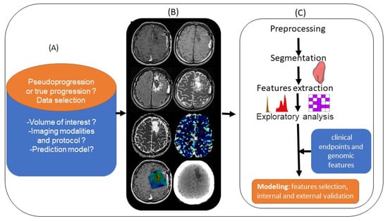 Medical imaging yields large amounts of information that are currently underused, and radiomics focuses precisely on ways of improving image analysis. It involves the high-throughput extraction of large numbers of image features and is one of the most recent innovations in medical imaging analysis []. The hypothesis is that the quantitative analysis of data for a given imaging modality using automated or semiautomated software can provide fuller and more complex information than a physician can. Tumors exhibit differences in shape and texture that can be measured using different imaging modalities []. Artificial intelligence approaches with radiomics cover the areas of diagnosis, prognosis, and treatment response. Improving disease stratification and advancing the personalized treatment of patients with glioblastoma appears to involve integrating radiomics into a multilayered decision framework with key molecular and clinical features []. Although this is an emerging topic, given the recency of the data and the different methodologies used by authors, radiomics analysis appears to involve the use of multimodal image acquisition (Figure 4A,B), segmentation or labeling, feature extraction, and finally statistical analysis (Figure 4C) to differentiate PsP from TP. Therefore, Chaddad et al. suggested that this means adopting optimized standard image processing, with a common criterion for performing segmentation, the fully automated extraction of radiomics features without redundancy, and robust statistical modeling validated in the prospective external setting []. Lambin et al. [] recently proposed calculating a radiomics quality score to aid the assessment of both past and future radiomics studies.