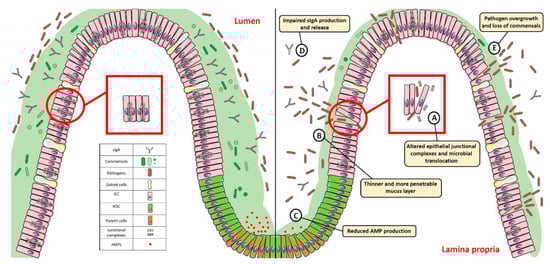 Gut homeostasis is established and maintained by the intestinal mucosal barrier. Alterations in its integrity and function, characterized by: (A) dysregulated junctional complexes, (B) thinner mucus layer, (C,D) reduced AMP and IgA production, and (E) pathogen overgrowth and penetration across the epithelial barrier, may perturb this fine balance and lead to gut dysbiosis. SIgA: Secretory Immunoglobulin A; AMP: antimicrobial peptide; IEC: intestinal epithelial cell; IESC: intestinal epithelial stem cell.