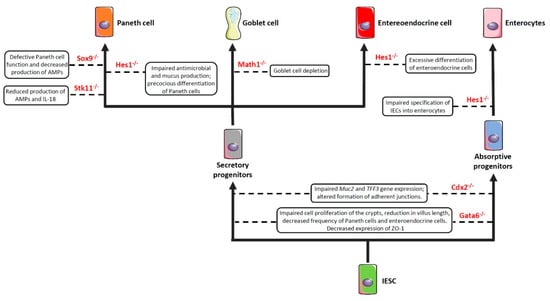 As previously anticipated, the intestinal barrier is characterized by a self-renewing epithelium, organized in crypts and villi, including both stem cells and differentiated cells. As the epithelial barrier has to deal with multiple physiologic activities, it requires different specialized cells, some of which are able to produce and secrete several molecules—such as antimicrobial peptides, mucins and hormones—and others that are able to adsorb water and nutrients. To achieve this goal, stem cells, after multiple transit-amplifying (TA) divisions, terminally differentiate into either secretory or absorptive lineages depending on the tightly regulated expression/inhibition of specific transcription factors [,]. For instance, the cell surface receptor Notch drives the cell commitment process by binding to the Notch ligands Deltalike (Dll) and Jagged families []. A cell expressing the Notch ligands will differentiate into a secretory cell (e.g., goblet cell, Paneth cell) upon expression of the Atonal BHLH Transcription Factor 1 (Atoh1), whereas a neighbour cell expressing the activated Notch receptor will induce the expression of the target gene hairy and enhancer of split 1 (Hes1)—a Atoh1 inhibitor—and will differentiate into an absorptive cell (e.g., enterocyte) []. Obviously, a dysregulated expression of the above-mentioned proteins definitely compromises the intestinal epithelial cell commitment and, in turn, the intestinal barrier integrity and function, as demonstrated by the association of several polymorphisms in genes encoding commitment-related transcription factors with intestinal barrier dysfunctions and intestinal inflammatory diseases (Figure 2) [,,,,]. In this context, by employing genetically engineered mouse models, Guo and colleagues demonstrated that deficiency of the Hes1 gene in IECs negatively affected antimicrobial peptides and mucus production, thus resulting in gut dysbiosis and inflammation []. Along the same line was the demonstration that mice deficient for Math1 (also referred to as Atoh1) displayed complete abrogation of goblet cells in the intestine []. Similar results were observed in mice with conditional deletion of the serine threonine kinase 11 (Stk11) gene, involved in the differentiation of stem cells into the secretory lineage cell types (e.g., goblet cells and Paneth cells), in IECs []. These animals displayed increased susceptibility to gut inflammation in association with reduced production of antimicrobial peptides and IL-18, as well as an uncontrolled expansion of colitogenic bacteria [].