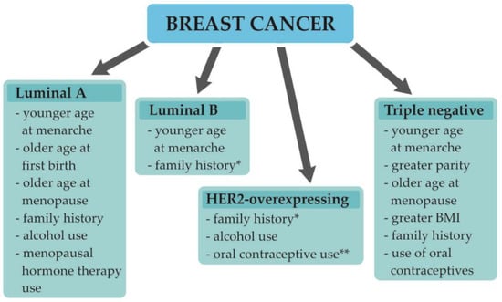Breast cancer molecular subtypes and their risk factors [4]. Abbreviations: BMI, body mass index; * there is insufficient or inconsistent evidence of an association between the luminal B breast cancer subtype and greater parity, older age at first birth, older age at menopause, greater BMI, alcohol use, use of oral contraceptives, or menopausal hormone therapy use; ** there is insufficient or inconsistent evidence of an association between HER2-overexpressing breast cancer and younger age at menarche, greater parity, older age at first birth, breastfeeding, older age at menopause, greater BMI, or menopausal hormone therapy use.