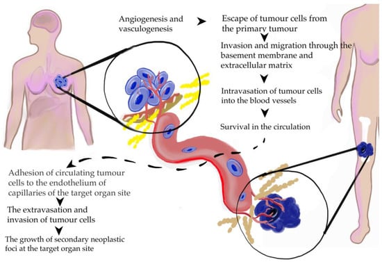 Metastasis is a complex, multistep process, where a subset of cancer cells leave the primary tumor and colonize distant organs [18]. The most important actions occurring over metastatic spread are shown in Figure 2.