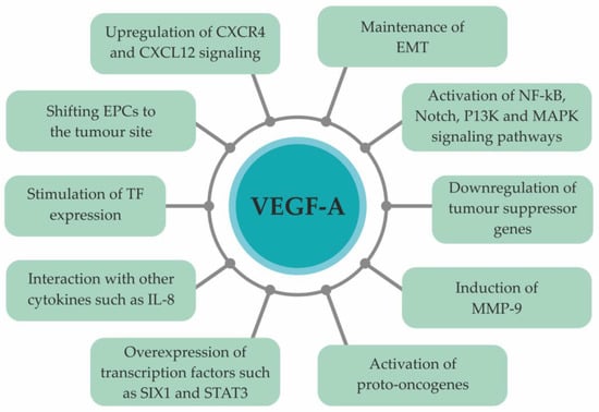 Role of VEGF-A in metastasis formation [100]. Abbreviations: VEGF-A, vascular endothelial growth factor A; EPCs, endothelial progenitor cells; TF, tissue factor; IL-8, interleukin-8; MMP-9, matrix metalloproteinase-9; EMT, epithelial-to-mesenchymal transition; CXCL12, C-X-C motif chemokine ligand 12; CXCR4, C-X-C receptor type 4.