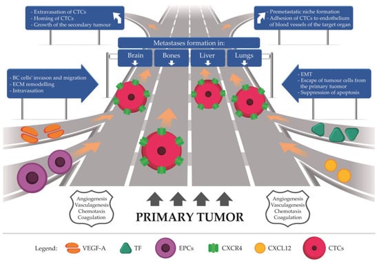 In this review, we aimed to discuss previous and current studies investigating the angiogenesis, vasculogenesis, chemotaxis, and coagulation processes and their role in the formation of distant metastases in bones, lungs, the liver, and the brain in BC patients. Furthermore, we wanted to emphasize their mutual relationships in cancer development and progression.