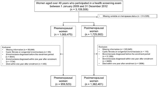 This study initially included 3,109,506 females older than 40 years who received a health screening exam in 2009 (index year). After excluding 314,529 participants with an uncertain menopause status, our study population contained 1,069,475 premenopausal and 1,725,502 postmenopausal participants. Among the 1,069,475 premenopausal participants, we identified 959,523 eligible participants after excluding those: (1) missing information for at least one variable (n = 99,644); (2) diagnosed with cystic fibrosis or congenital bronchiectasis (n = 85); (3) diagnosed with bronchiectasis before the enrolment period (n = 8044); (4) diagnosed with bronchiectasis within one year after enrolment (n = 1734); or (5) who died within one year of enrolment (n = 445). Among the 1,725,502 postmenopausal participants, we identified 1,362,401 eligible participants after excluding those: (1) missing information for at least one variable (n = 320,845); (2) diagnosed with cystic fibrosis or congenital bronchiectasis (n = 115); (3) diagnosed with bronchiectasis before the enrolment period (n = 31,556); (4) diagnosed with bronchiectasis within one year after enrolment (n = 6689); or (5) who died within one year of enrolment (n = 3896) (Figure 1). The participants were tracked from the index year until the date of a bronchiectasis diagnosis, death, or 31 December 2018.