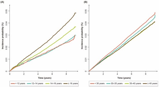 Cumulative incidence probability (%) of bronchiectasis: (A) premenopausal women according to age at menarche; (B) postmenopausal women according to reproductive period.