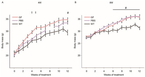 Growth curves of the different treatment cohorts. The growth pattern of the six groups in the 4W cohort (A) and the 8W cohort (B). Lack of data point in 4W PBS is due to accidental loss of measurements. GF, growth factor; PBS, phosphate-buffered saline; WT, wild-type strain. Vertical bars are SEM. Two-way ANOVAs were performed with subsequent Tukey HSD post-hoc tests to assess significance. Symbols indicate p < 0.05: ‡; GF vs. PBS, #; PBS vs. WT. The number N of each group was 12.