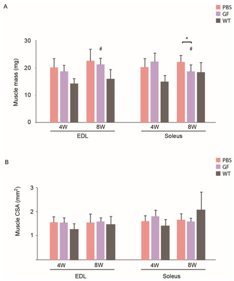 Muscle mass (A) and CSA (B) of hind-limb muscles of young (4W) and adolescent (8W) mdx mice treated for 12 weeks with growth factors. N for 4W animals: PBS, 12; GF, 11; WT, 11. N for 8W animals: PBS, 12; GF, 9; WT, 12. CSA, cross-sectional area; EDL, m. extensor digitorum longus; GF, growth factor; PBS, phosphate-buffered saline; WT, wild-type strain. Data presented as mean and vertical bars representing SD. Two-way ANOVAs were performed with subsequent Tukey HSD post-hoc tests to assess significance. Horizontal bars indicate significance: * p < 0.05, # p < 0.05 vs. 4W animals.