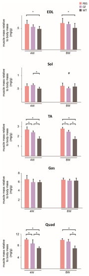 Second, as there was no difference between mdx body mass in each age group at the conclusion of treatment, we investigated how muscle mass related to body mass (Figure 3). In both age groups, EDL, TA, and quadriceps revealed that in untreated mdx mice, these muscles were relatively larger than in WT animals. In 4W mdx, TA and quadriceps treated with GF had a relatively lower mass than in untreated mice. In 8W mdx, only TA had a lower relative mass than PBS.