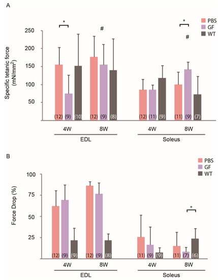 Ex vivo specific tetanic force and force drop in EDL and soleus of mdx treated for 12 weeks with growth factors. (A) Specific force of tetanic contraction in EDL and soleus of 4W and 8W mdx. (B) Force drop in muscles subjected to a stretch protocol. N is showed in the table in parentheses and may vary due to non-responsiveness to stimuli or loss of connection to the force transducer during the protocol. EDL, m. extensor digitorum longus; GF, growth factor; PBS, phosphate-buffered saline; WT, wild-type strain. Data presented as mean and vertical bars representing SD. Two-way ANOVAs were performed with subsequent Tukey HSD post-hoc tests to assess significance. Horizontal bars indicate significance: *: p < 0.05, #: p < 0.05 vs. 4W animals.