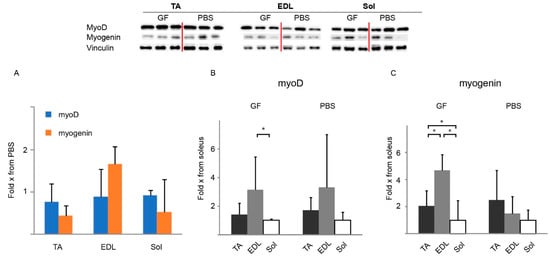 Western blotting of myogenic transcription factors in relation to PBS or soleus in adolescent (8W) mdx treated for 12 weeks at the conclusion of treatment. Representative bands are shown (all bands can be seen in Supplementary Materials Figure S3). (A) Levels of myoD and myogenin in EDL, TA, and soleus in response to GF treatment relative to PBS. (B,C) Levels of myoD (B) and myogenin (C) in various muscles relative to soleus. A: N = 6 for all groups. B and C: N = 6 for all groups except EDL of PBS group (n = 5). EDL, m. extensor digitorum longus; GF, growth factor; PBS, phosphate-buffered saline; Sol, m. soleus; TA, m. tibialis anterior. Data presented as bars with the respective mean and SD as vertical bar. Two-way ANOVAs were performed with subsequent Tukey HSD post-hoc tests to assess significance. Horizontal bars indicate significance: *: p < 0.05.