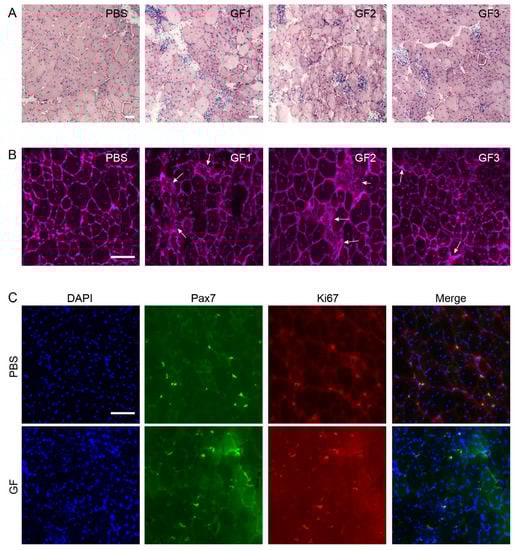 Effect of treatment on histopathology. H&E, WGA, and IHC stains of treated (GF) versus controls (PBS) mdx animals. (A) H&E stains demonstrate fiber size variation, focal inflammation, and necrotic fibers in treated animals compared to controls. (B) WGA showed increased fibrosis (arrows) in treated animals. (C) DAPI (blue), Pax7 (green), and Ki67 (red) showed activation of satellite cells. Bars represent 50 mm.